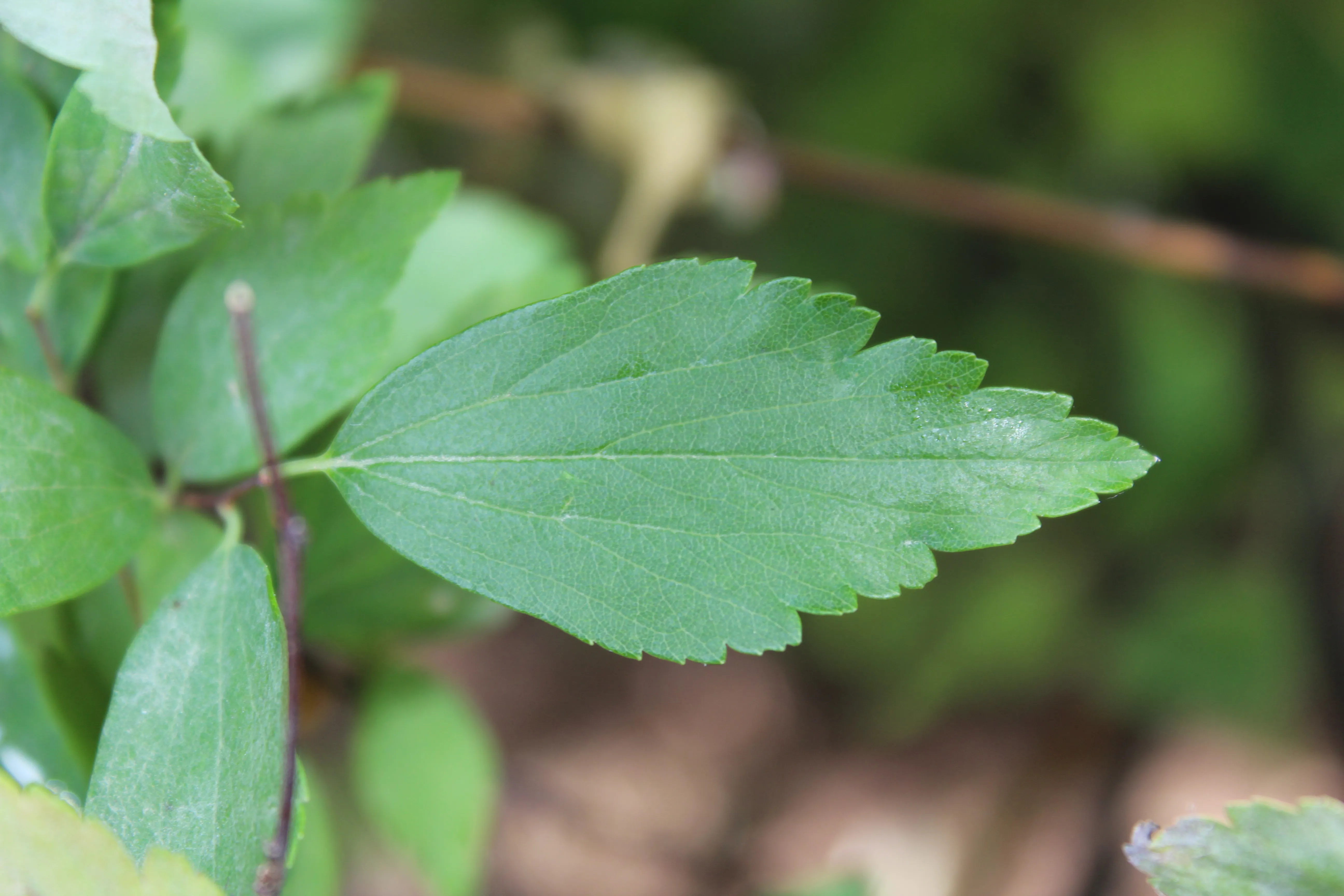 Arbusto caduco, alcanza 1,5m de altura. Ramas delgadas, rígidas, erectas y sin tomentos, de color castaño. Hojas lanceoladas a ovadas, doblemente aserradas hasta el tercio inferior, de color verde oscuro por el haz y con nervios pelosos por el envés. Flores pentámeras, de color blanco y pequeó tamaño, reunido en panículas